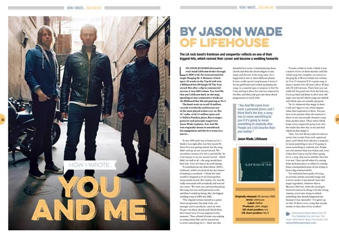 The band went on to sell 15 million records worldwide and become one of the most played artists ever on ‘Hot AC’ radio, with 1.5 million spins and 1.4 billion Pandora plays. But as singer, guitarist and principal songwriter Jason Wade explains, You And Me was originally meant to soundtrack his engagement and the love scene in a movie…